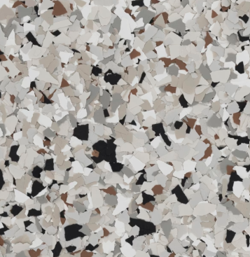 Epoxy flake floor installed by IronShield Concrete Coatings, featuring a durable gray, black, and white flake finish with a seamless, slip-resistant surface.